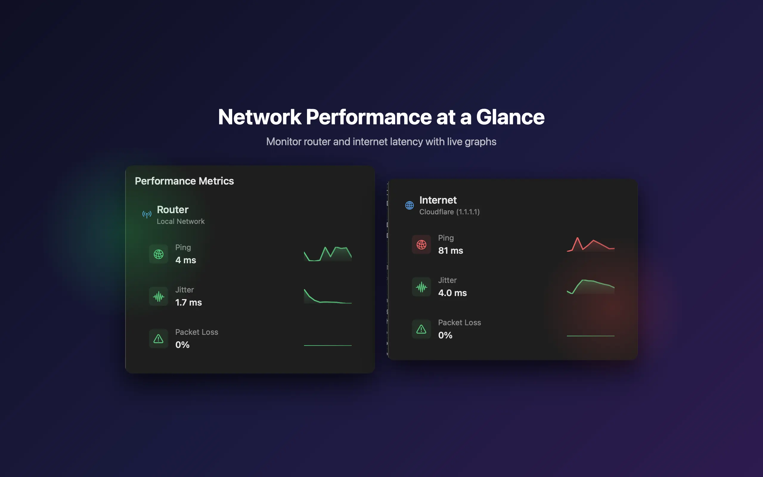 Monitor ping, jitter, and packet loss to both your router and the internet.